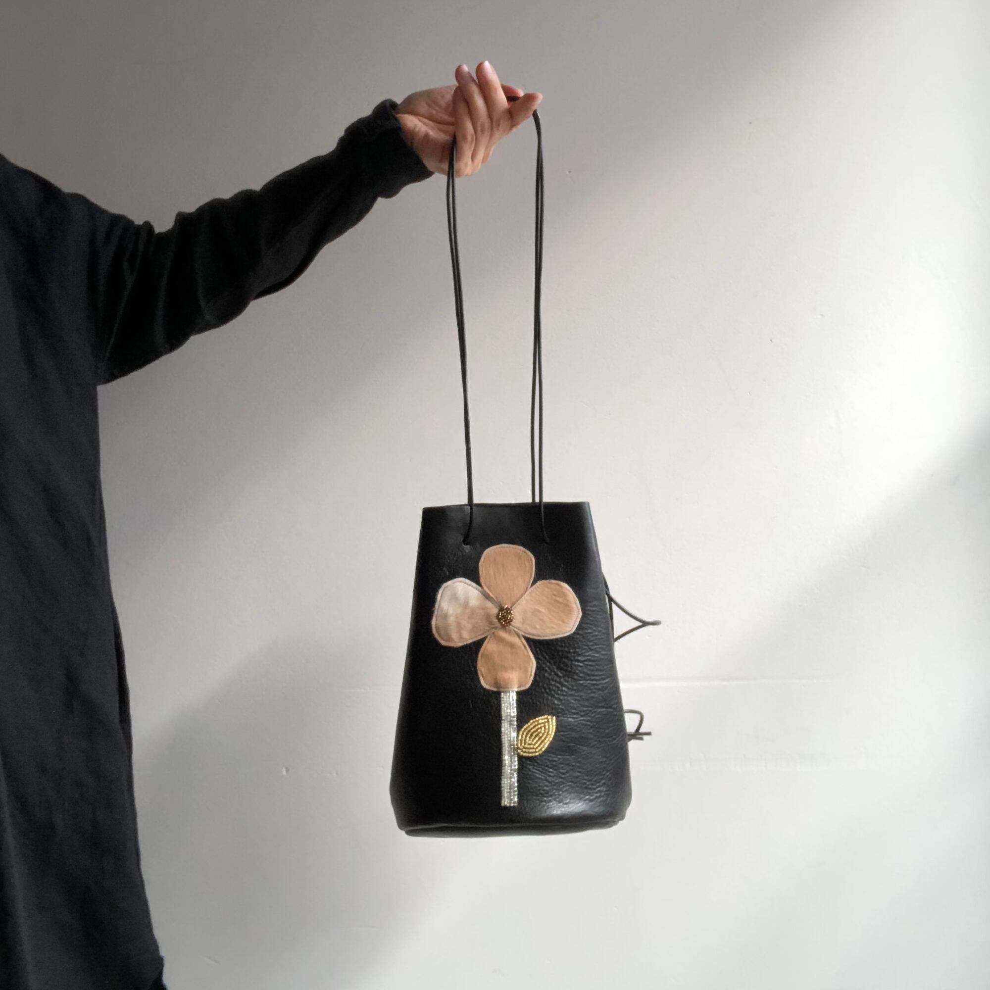 花はハラコ、茎と葉っぱにオートクチュールビーズ。